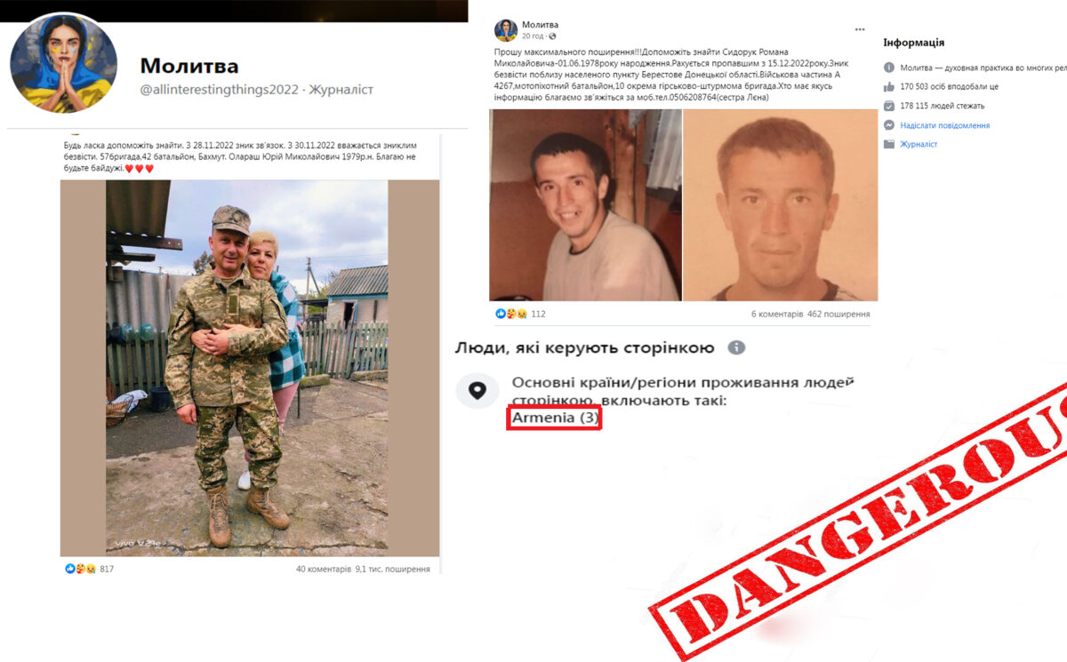 Групою керують три адміністратори з Вірменії. Сторінка «Молитва» пов’язана з щонайменше ще 6 групами: «Пошук зниклих», «Україна сьогодні, Доброго вечора, ми з України!», «Пошук людей під час війни», «Сильная Украина», “Пошук людей/ Поиск людей«.Їх модерують і в Індії, і в Індонезії, та у В’єтнамі тощо. Такі патріотичні назви однозначно викликають довіру та надію, але потрібно бути пильним.