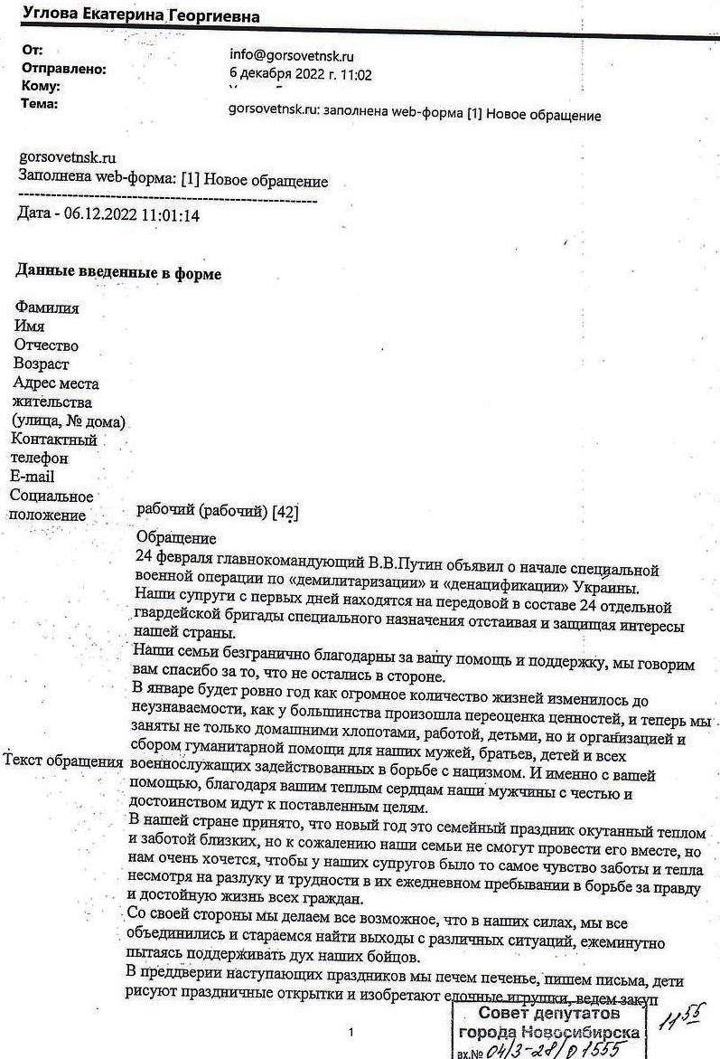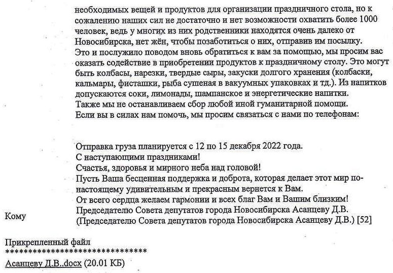 Цікавий документ напередодні Нового року оприлюднив Telegram-канал «россия 24/7». У своєрідному листі-запиті до новосибірських депутатів родичі тамтешніх мобіків опікуються тим, як їхні вояки-окупанти святкуватимуть настання 2023 року. І головне — з чим. От і попросили сибіряки своїх обранців організувати комплектацію посилок на фронт.