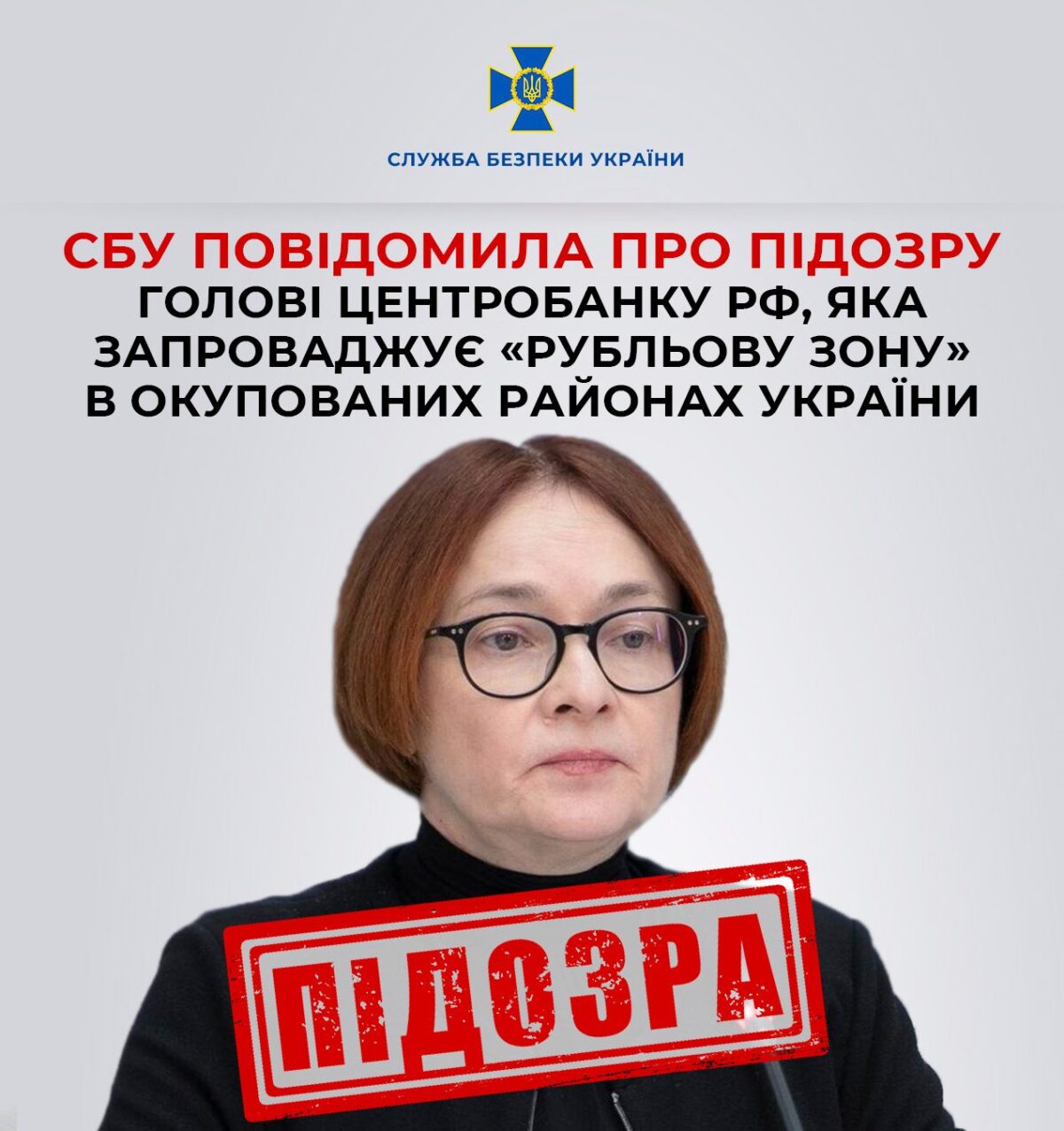 На підставі доказів СБУ голові центробанку росії повідомлено про підозру за ч. 3 ст. 110 Кримінального кодексу України.