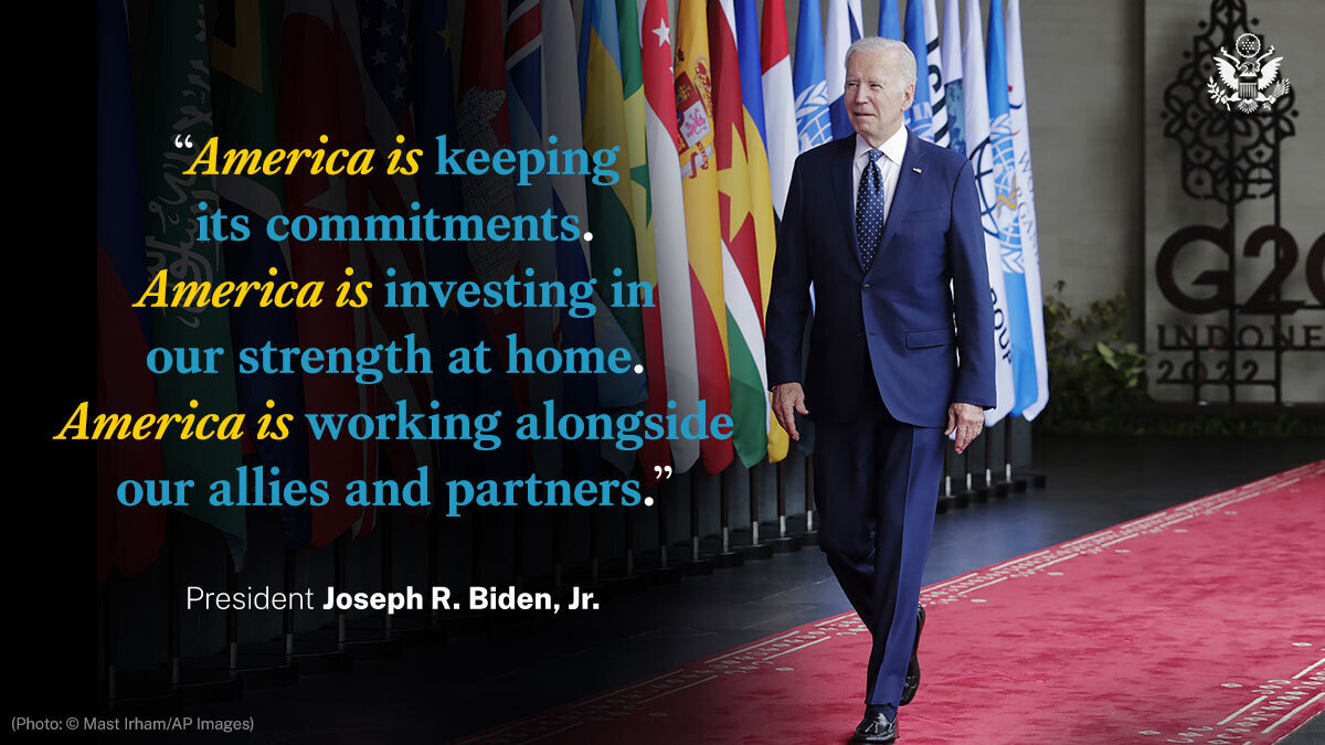 В ілюстрації, доданій до розміщеного допису, наводяться також слова президента Байдена: «Америка дотримується своїх зобов’язань. Америка інвестує у нашу силу вдома. Америка працює разом із нашими союзниками й партнерами».