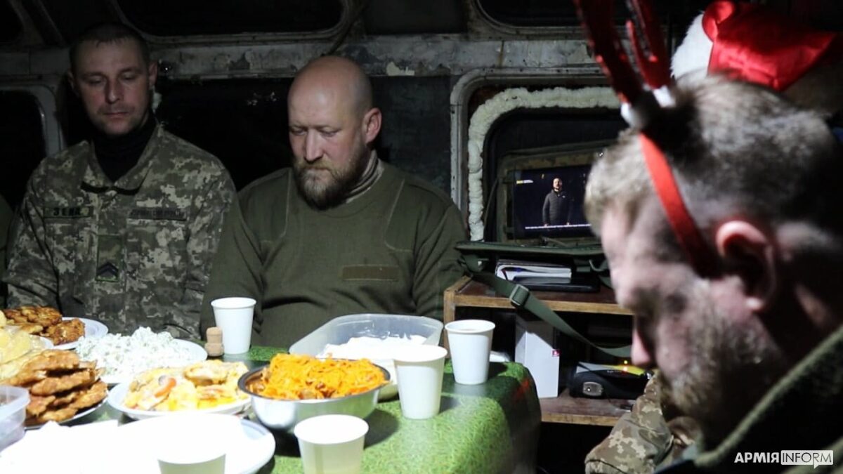 П’ятнадцять хвилин до Нового року. Один із підрозділів територіальної оборони Київщини слухає привітання Верховного Головнокомандувача. Більшу частину промови слухають мовчки. Лише раз за столом чути сміх, коли Володимир Зеленський згадує про жінку, яка збила ворожий дрон банкою помідорів.