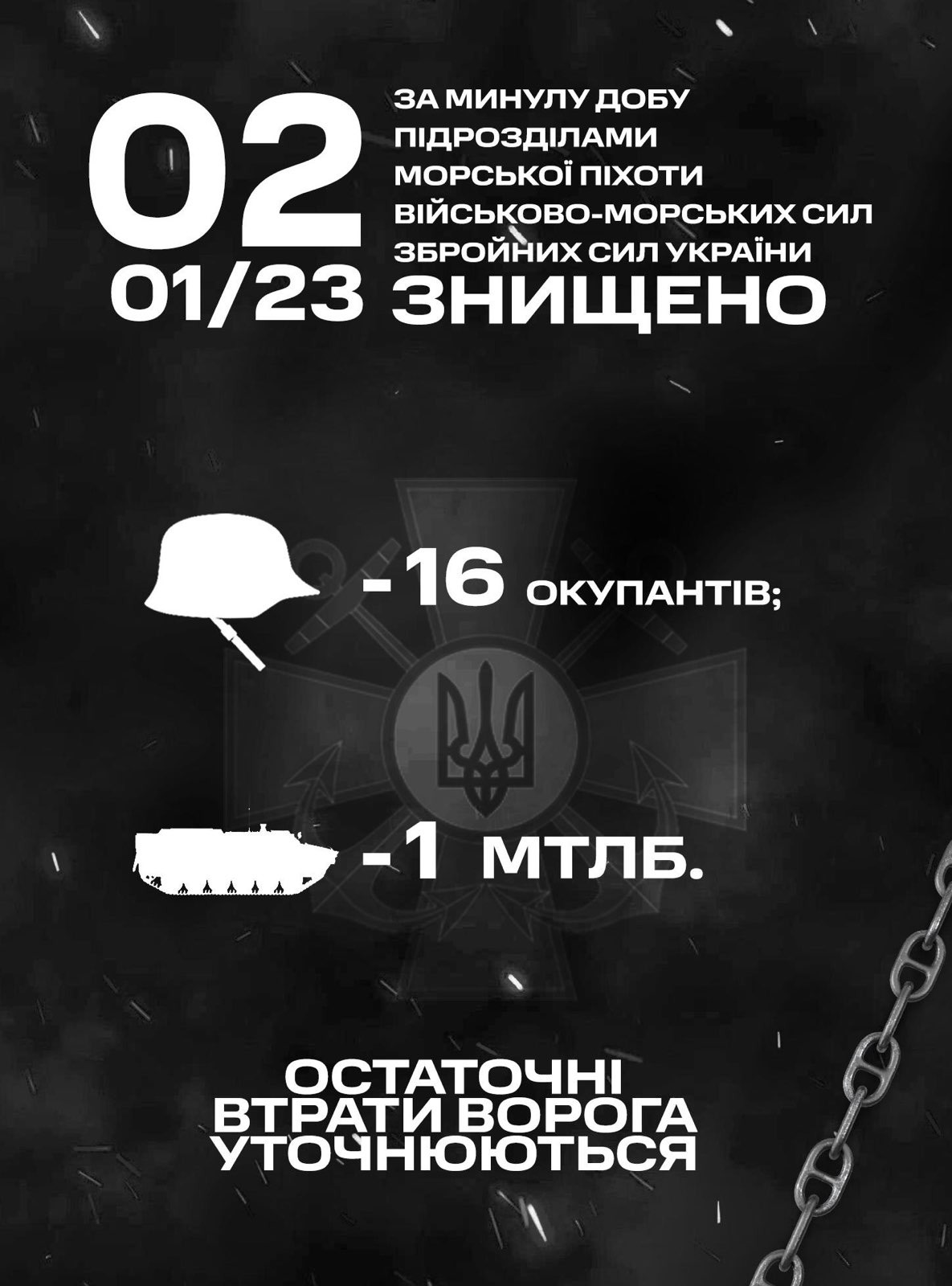 — Минулої доби, 1 січня, морські піхотинці знищили 1 МТЛБ та 11 окупантів. Артилерійські військові частини та підрозділи Командування морської піхоти ВМС ЗС України наносили вогневе ураження по загарбниках, у результаті чого було знищено 5 російських військових. Остаточні втрати ворога уточнюються, — ідеться в повідомленні.