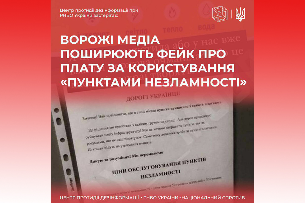 Під час аналізу інформаційного простору аналітики Центру виявили фейкове повідомлення про нібито впровадження системи оплати за користування «Пунктами Незламності».