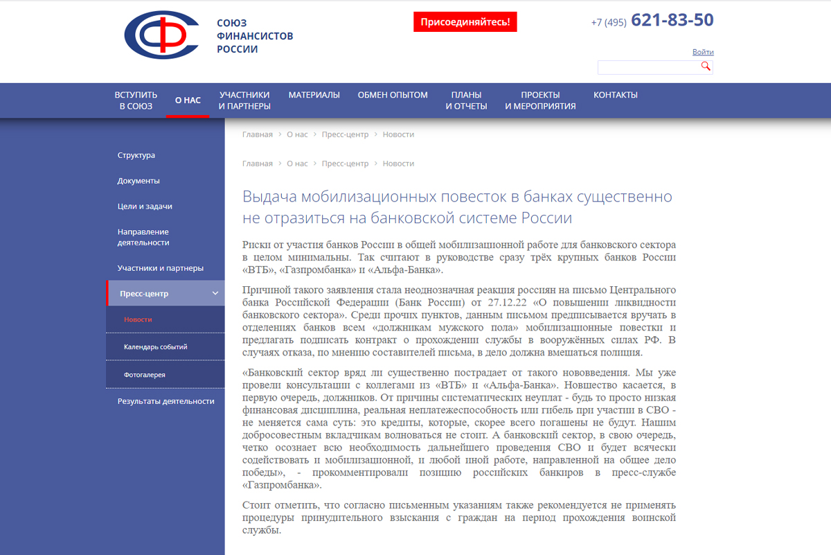 Своєю чергою союз фінансистів росії на своїй офіційній сторінці розмістив повідомлення, у якому йдеться, що видача мобілізаційних повісток у банках на банківській системі росії суттєво не позначиться.