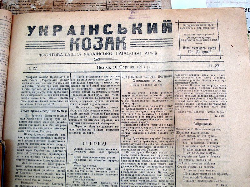 Вже в cвій край холодний утіка москаль. Скоро встане сонце, і загинуть тучі, Як загине в серці днів моїх печаль.(газета «Український козак», 1 липня 1919 року) |