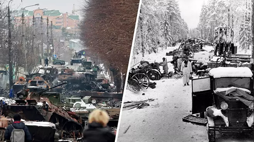 Понад 80 років потому те саме враження справили на весь світ світлини колон спаленої техніки російських загарбників на українських дорогах.