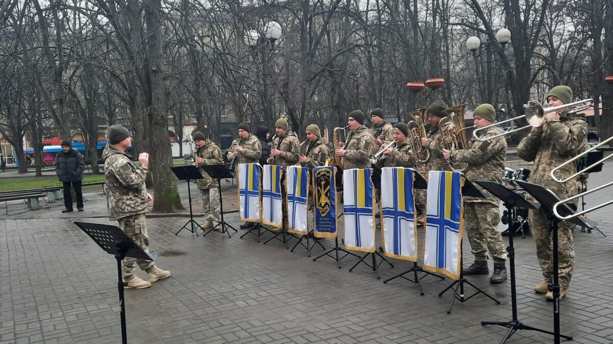 Військовий оркестр окремої артилерійської бригади імені генерал-хорунжого Олексія Алмазова ВМС ЗСУ виступив з кавером на пісню In the shadows у центрі Миколаєва. Захід націлений підійняти настрій та привітати жителів міста з Різдвом.