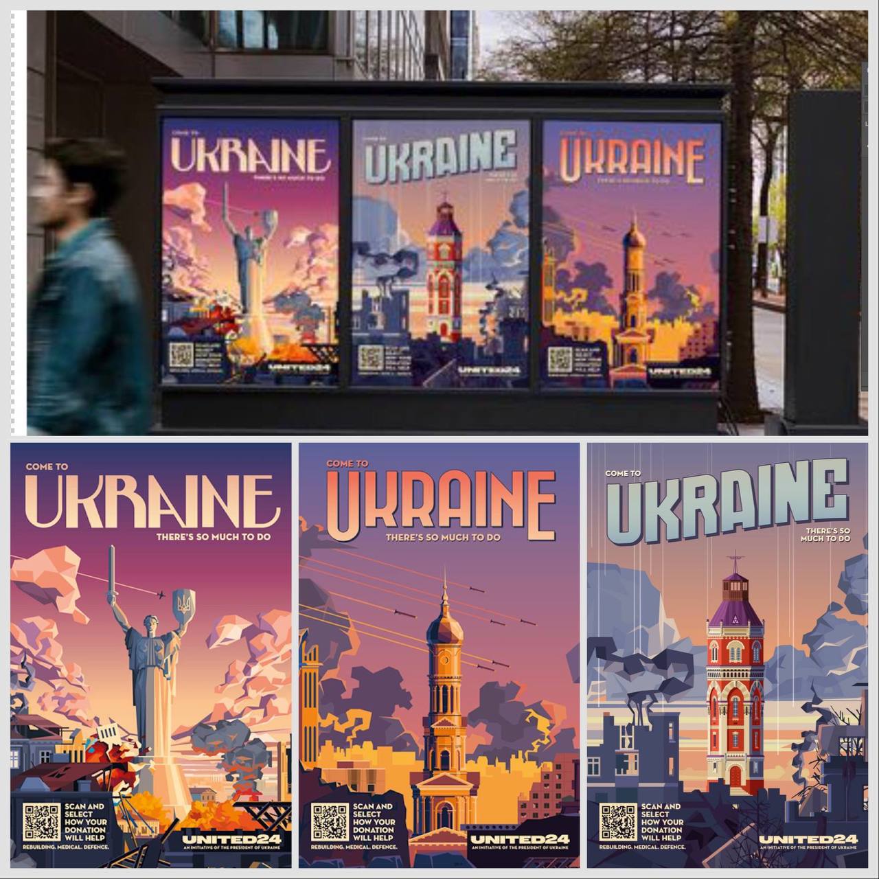 “Креативники Pablo, які працюють з Adidas, Nutella, Citroëen та іншими відомими брендами, створили туристичні постери у ретро-стилі, які запрошують до України та показують історичні будівлі й туристичні місця, зруйновані російськими ракетами”,— йдеться у повідомленні.