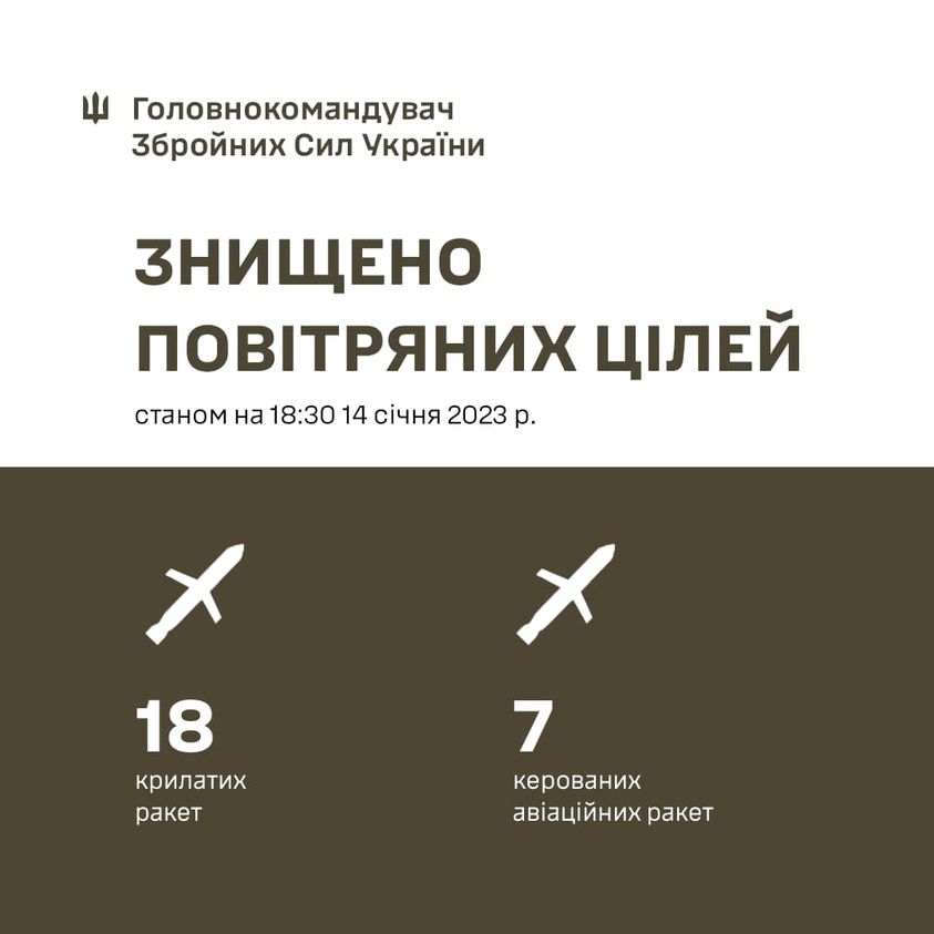 Силами та засобами Повітряних Сил Збройних Сил України у взаємодії з підрозділами інших складових Сил оборони знищено 18 крилатих ракет та 7 керованих авіаційних ракет.