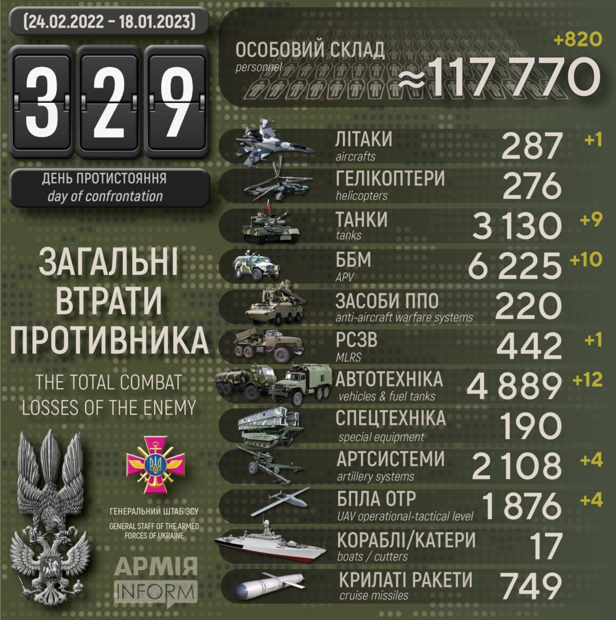 Загальні бойові втрати противника з 24.02.22 по 18.01.23 орієнтовно становлять: