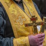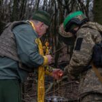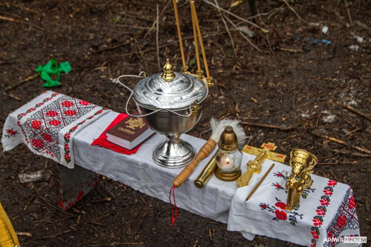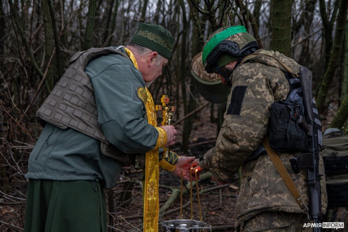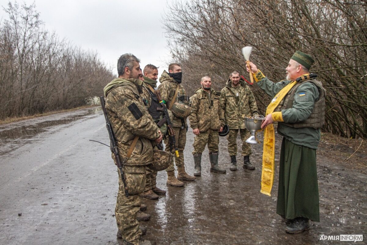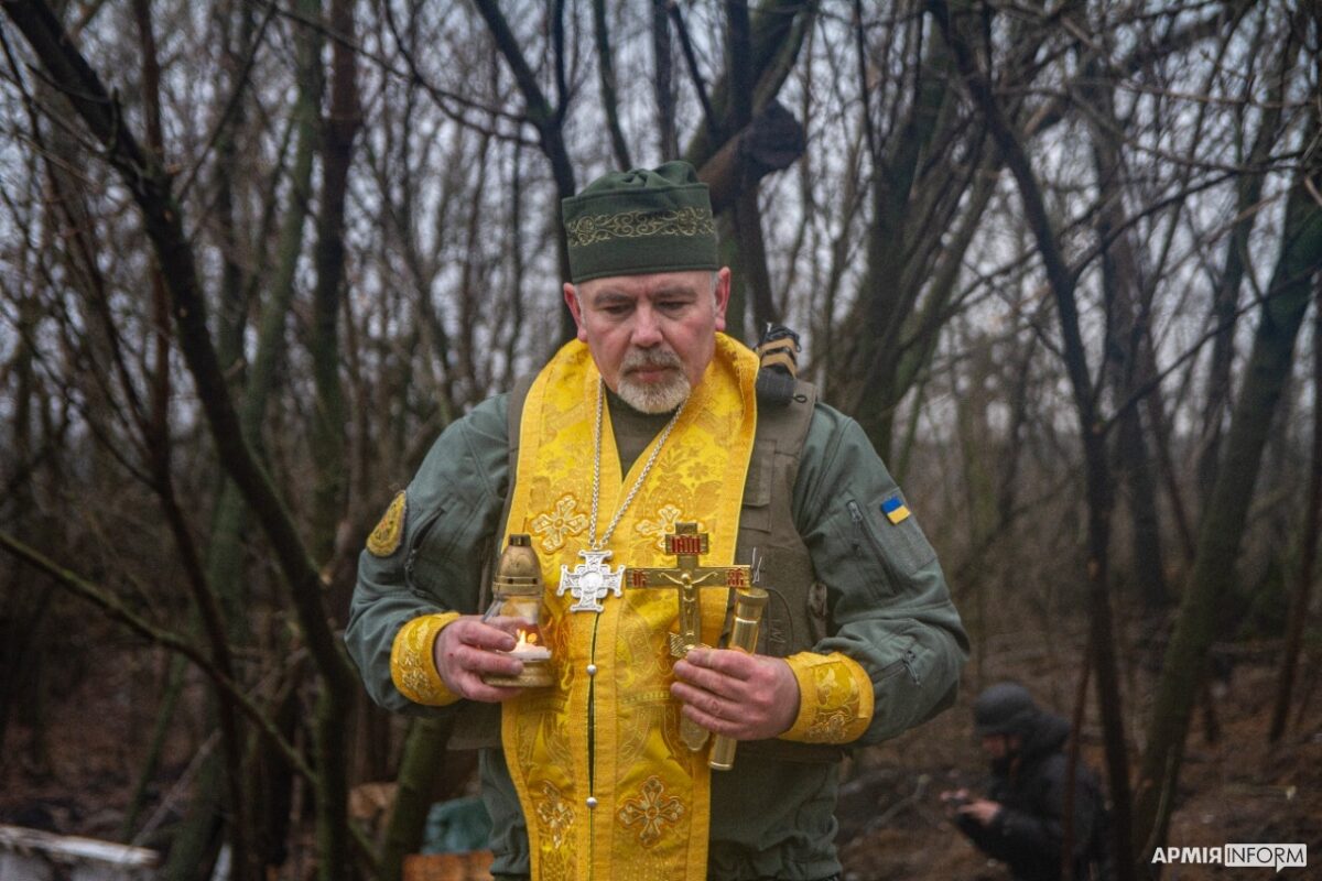 На ВОП разом із нами, аби привітати тероборонців із Водохрещем, приїхав і військовий капелан, отець Володимир. Для проведення літургії він розкладає свій церковний скарб на лавці прямо на узбіччі дороги. Каже, що за час повномасштабної навали орків уже звик служити Богові в польових умовах.