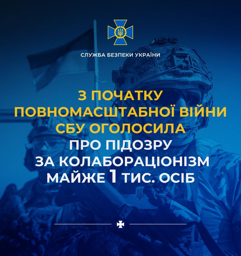 З початку повномасштабної агресії рф Служба безпеки розслідує більше 2 тис. кримінальних проваджень щодо колаборантів. У рамках цих проваджень уже майже 1 тис. осіб отримали повідомлення про підозру.