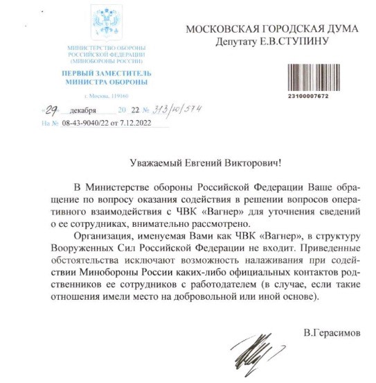 «Організація, яку ви називаєте ПВК „вагнер“, до структури збройних сил російської федерації не входить. Наведені обставини унеможливлюють налагодження за сприяння міноборони росії будь-яких офіційних контактів родичів її співробітників з роботодавцем (у разі, якщо такі відносини були на добровільній чи іншій основі)», — написано у відповіді.