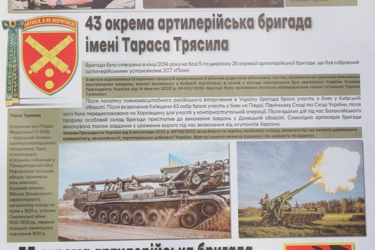 — На цих стендах розміщені 36 наших частин, військових бригад, назви яких пов’язані з історією України. Наприклад, 72-га механізована бригада імені Чорних Запорожців, — зазначає заступник начальника Центру досліджень воєнної історії ЗСУ. — Сто років тому Україна захищалася від російської агресії під час війни 1917–1920-х років. Чорні Запорожці були частиною армійців, які боронили тоді нашу державу. І нині в сучасному складі бригади, названої на честь славетних предків, військові продовжують цю боротьбу.