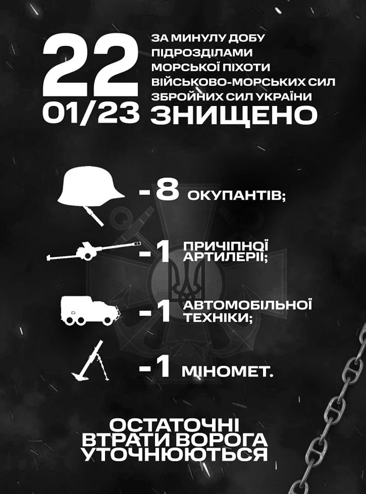 Військові частини та підрозділи Командування морської піхоти Військово-Морських Сил Збройних Сил України, які входять до складу угруповань, продовжували виконувати завдання щодо відсічі повномасштабної збройної агресії російської федерації. Минулої доби, 21 січня, морські піхотинці знищили 3 окупантів.