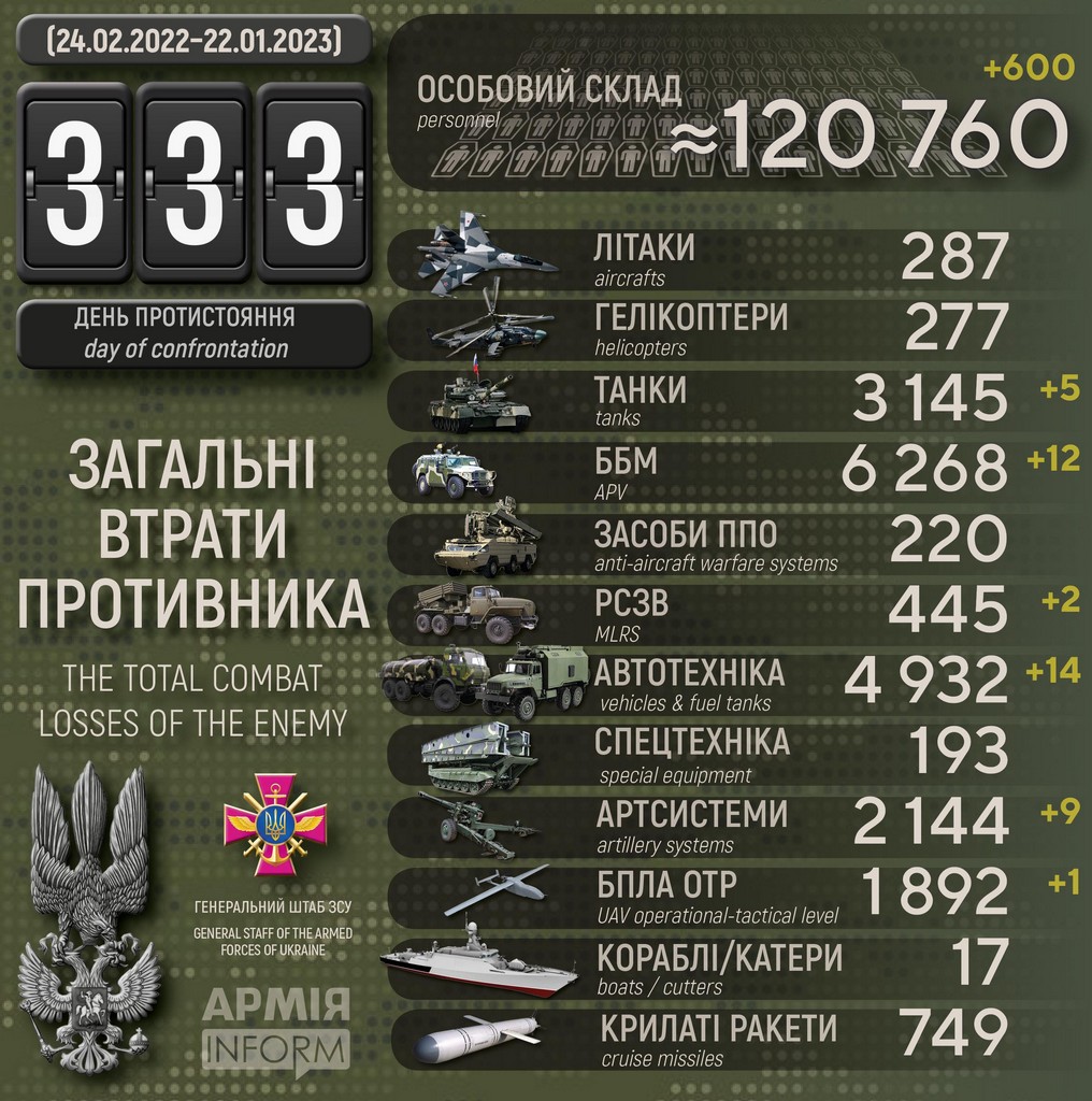 Загальні бойові втрати противника з 24.02.22 по 21.01.23 орієнтовно становлять: