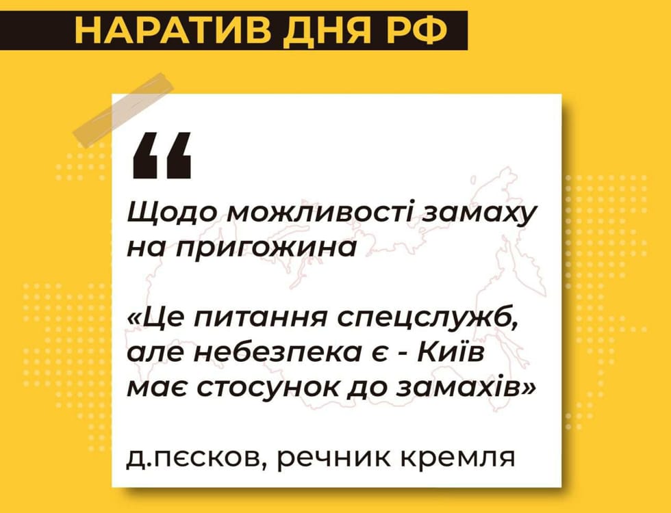 За твердженням Центру протидії дезінформації, заява пєскова щодо можливості замаху на пригожина прозвучала на адресу самого пригожина, який активно дискредитує ЗС рф останні декілька місяців.