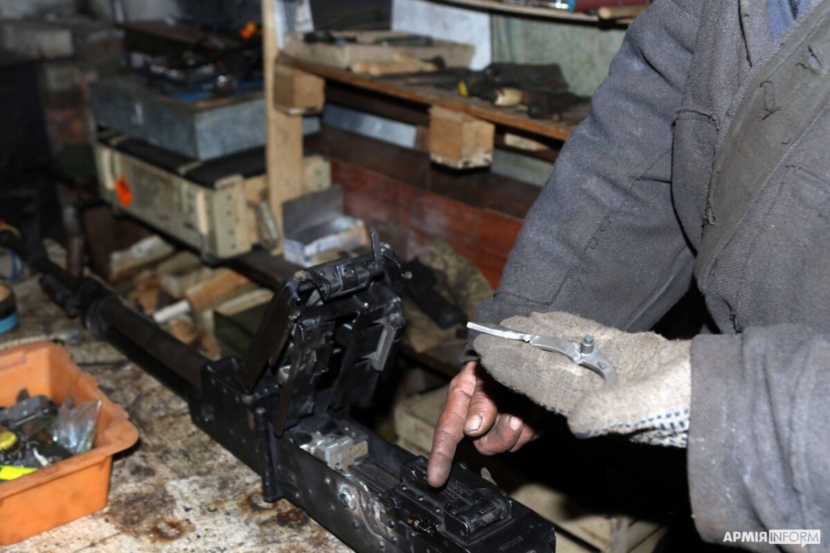 У сусідньому приміщенні працюють фахівці з відновлення ракетно-артилерійського озброєння. Тут проводять у прямому сенсі тонку роботу з відновлення пошкодженого озброєння. Автомати, кулемети чи гармати в руках військових умільців отримують друге життя.