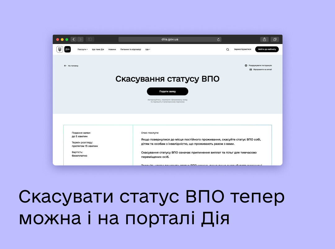 Раніше ВПО, які повернулися на місце постійного проживання, могли скористатися цим сервісом у застосунку Дія. Тепер скасування статусу доступне і на порталі. Це дозволить скасовувати статус внутрішньо переміщеної особи швидко та зручно як на смартфоні, так і через десктопну версію сайту. Ви самостійно обираєте потрібний гаджет і в декілька кліків можете скористатись послугою.