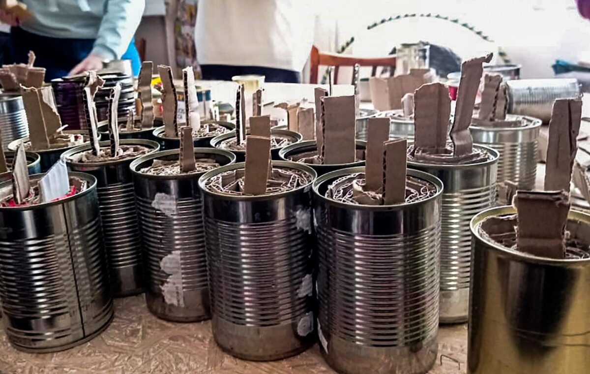 Нескладні інгредієнти для створення окопних свічок, жестяні банки, гофрований картон тощо, пластуни приносять із дому або збирають разом зі своїми товаришами.