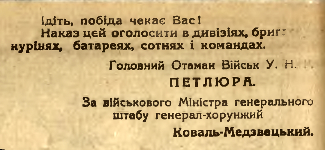 Прикметно, що саме за підписом Миколи Коваля-Медзвецького як генерал-хорунжого Генерального штабу, який заміщав військового міністра, було видано Наказ Головної Команди військ УНР від 20 вересня 1920 року. Він з’явився під час переможного контрнаступу Дієвої Армії УНР у другій половині вересня 1920 року, коли українським збройним силам вдалось розгромити і суттєво відкинути на схід радянські війська. Слова того наказу якнайкраще перегукуються із сучасністю: