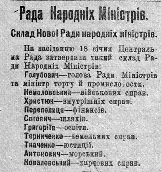 Частина з кандидатів на посади міністрів виявились майже невідомими більшості членів Центральної Ради. Стосувалось це передусім двох з них — Степана Перепелиці та Івана Немоловського, причому саме вони претендували на портфелі у важливих міністерствах — фінансів та військових справ. Іван Немоловський до того ж був вітчимом дружини Всеволода Голубовича — це змушує підозрювати, що посаду він отримав через родинні зв’язки з майбутнім прем’єром.