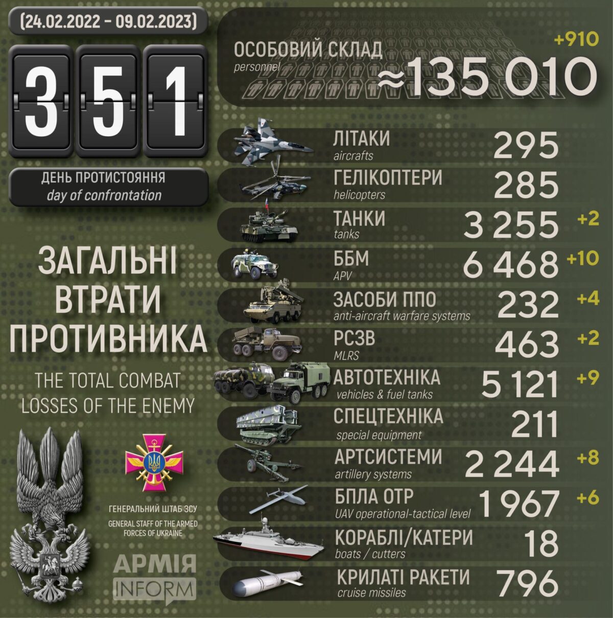 Загальні бойові втрати противника з 24.02.22 по 09.02.23 орієнтовно становлять: