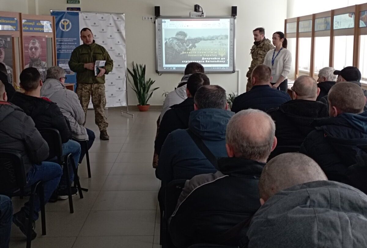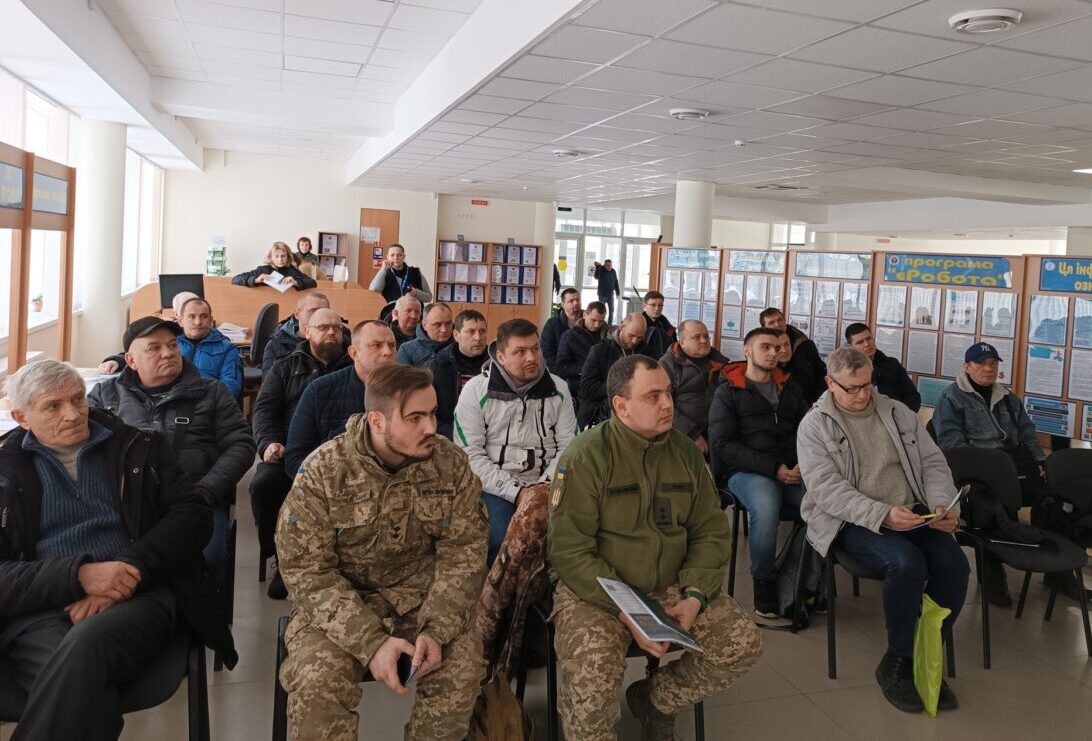 – Захід відбувся у Житомирській філії Житомирського обласного центру зайнятості, і в ньому взяли участь 30 чоловіків, які наразі не мають постійної роботи, – пояснює начальник пресслужби РТЦК та СП капітан Вікторія Шевчук. – А з іншого боку – наші офіцери та представники Головного управління Національної поліції України в Житомирській області. Ми запрошували військовозобов’язаних громадян України приєднатися до лав Житомирського стрілецького батальйону Збройних Сил України, а співробітників поліції – до штурмових бригад «Гвардії наступу», які наразі створюються.