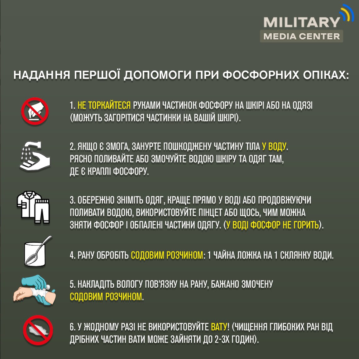 ▫️2. Якщо є змога, занурте пошкоджену частину тіла у воду. Рясно поливайте або змочуйте водою шкіру та одяг там, де є краплі фосфору.