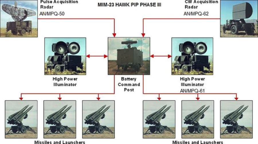 Радари безперервного хвильового та імпульсного збору даних (CWAR) AN/MPQ-34 або AN/MPQ-55 (HAWK phase II) забезпечують виявлення цілей на низькій та середній висоті, тоді як High Power Illuminator відстежує та підсвічує цілі (HIPIR) AN/ MPQ-33-39 або AN/MPQ-46 (фаза I HAWK), або AN/MPQ-57 (фаза II HAWK), або AN/PQ-61 (фаза III HAWK). Ракета MIM-23 HAWK виконує функцію ураження цілі, забезпечуючи потужний захист від літаків і гвинтокрилів, крилатих ракет і тактичних балістичних ракет малої дальності. Пускові установки, крім функції наведення ракети, підтримують команди перед пуском і транспортують ракети в тактичних ситуаціях.