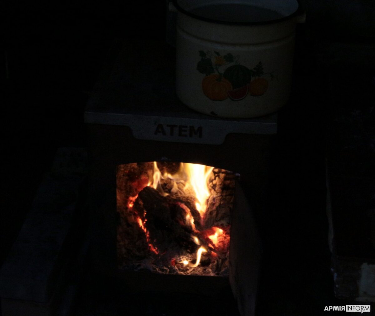 Біля печі достиг запарений чай, моложавий чоловік у «мультикамі» акуратно налив його в залізні горнятка, розставлені кружком. Й досі не відігріті руки охоче обіймають їхні гарячі боки, хтось підкидує поліно у вогонь.Полиски полум’я спершу пригасають, потім спалахують свіжим помаранчем і ніби перемикають розмову на іншу тему.