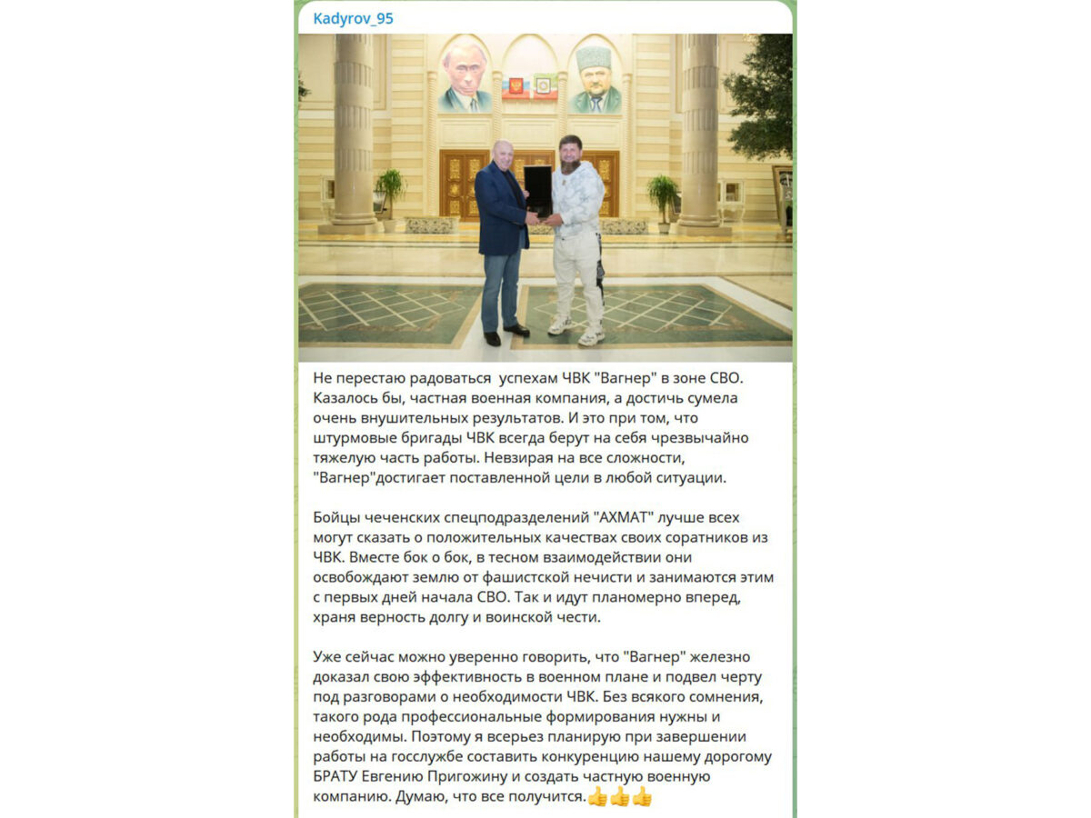 У своєму телеграм-каналі чеченський колаборант, головнокомандувач тікток-військ рф, герой росії та вбивця росіян рамзан кадиров висловився на підтримку пригожинського бандформування-штрафбату «вагнер». У повідомленні головний тіктокер сказав, що після завершення свого «провінційного царювання» збирається створити конкуренцію «своєму братові» пригожину, акцентуючи на буцімто успіхах його найманців.