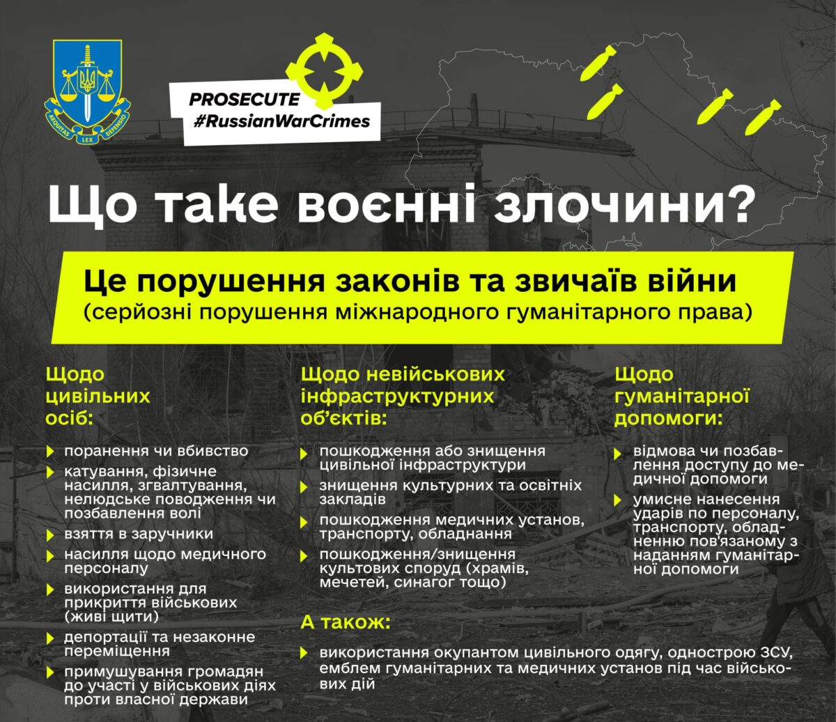 Відразу зауважимо, що не будь-які злочини можуть вважатися воєнними. Плюс варто розрізняти воєнні та військові злочини. Перші стосуються, наприклад, незаконного переміщення цивільних, знищення цивільної інфраструктури (школи, лікарні, музеї), блокування надання гуманітарної допомоги. А вже військові злочини — це про дезертирство та інші схожі речі.