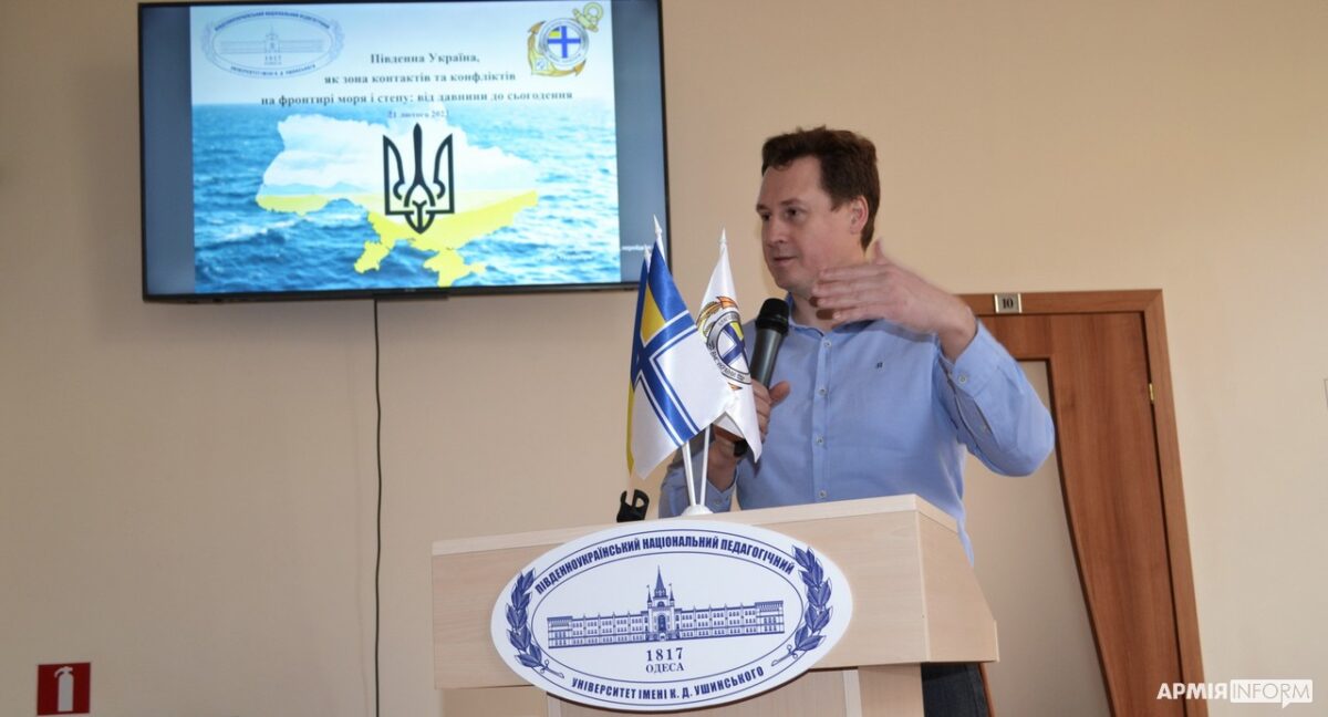 У зв’язку із цим дуже символічно та актуально, що, саме напередодні роковин від дня широкомасштабного російського нападу, в Одесі у приміщенні наукової бібліотеки Південноукраїнського національного педагогічного університету імені К. Д. Ушинського відбулася конференція за темою: «Південна Україна як зона контактів та конфліктів на фронтирі моря і степу: від давнини до сьогодення», організована за ініціативи науково-педагогічного складу вишу та Благодійного фонду сприяння та розвитку Військово-Морських Сил України.