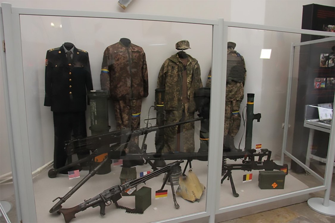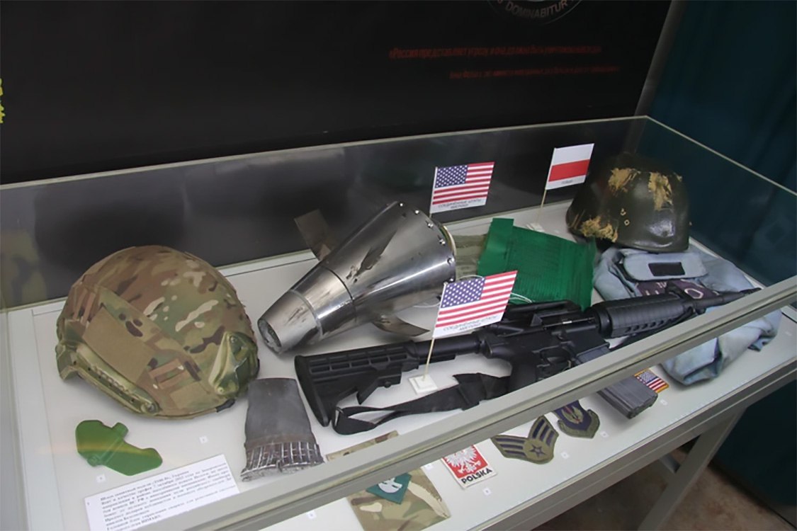 На стендах гордливо розміщені західні зразки зброї невідомого походження, з дбайливо розставленими табличками-прапорами та підписами — мовляв, дивіться, ось воно, НАТО! Той факт, що про постачання зброї до України представники цих самих країн самостійно повідомляють у ЗМІ та/або на сайтах МЗС, міноборони тощо, адже Україна — це не квазіутворення іхтамнєтов з шахтарями і трактористами, які у військторгах купують танкові дивізії, а суверенна країна з власними міжнародними відносинами, яка може укладати контракти на постачання обладнання з будь-якою країною світу за обопільною згодою, бо росіяни таких «хитромудрих схем» не розуміють.