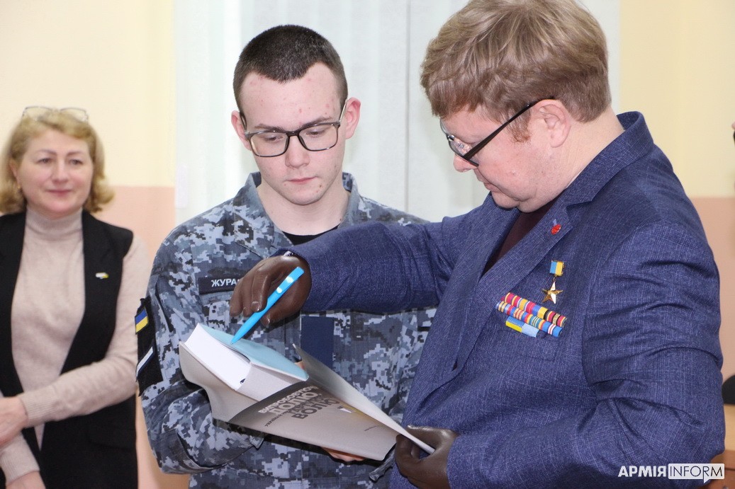 Звісно, не обійшлося без подарунків. Бібліотека ліцею поповнилася книгами від Міністерства культури та інформаційної політики України, деякі примірники Володимир Жемчугов особисто подарував найактивнішим вихованцям флотського навчального закладу.