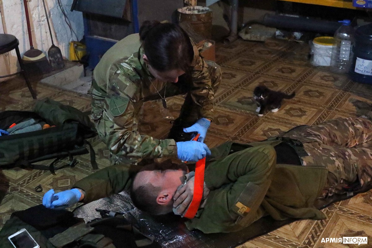 Воїни однієї з бригад Сил територіальної оборони ЗСУ, що боронить Донеччину, відшліфовують свої знання та навички з тактичної медицини. Акцент таких практичних занять спрямований на вміння правильно надавати домедичну допомогу на полі бою.
