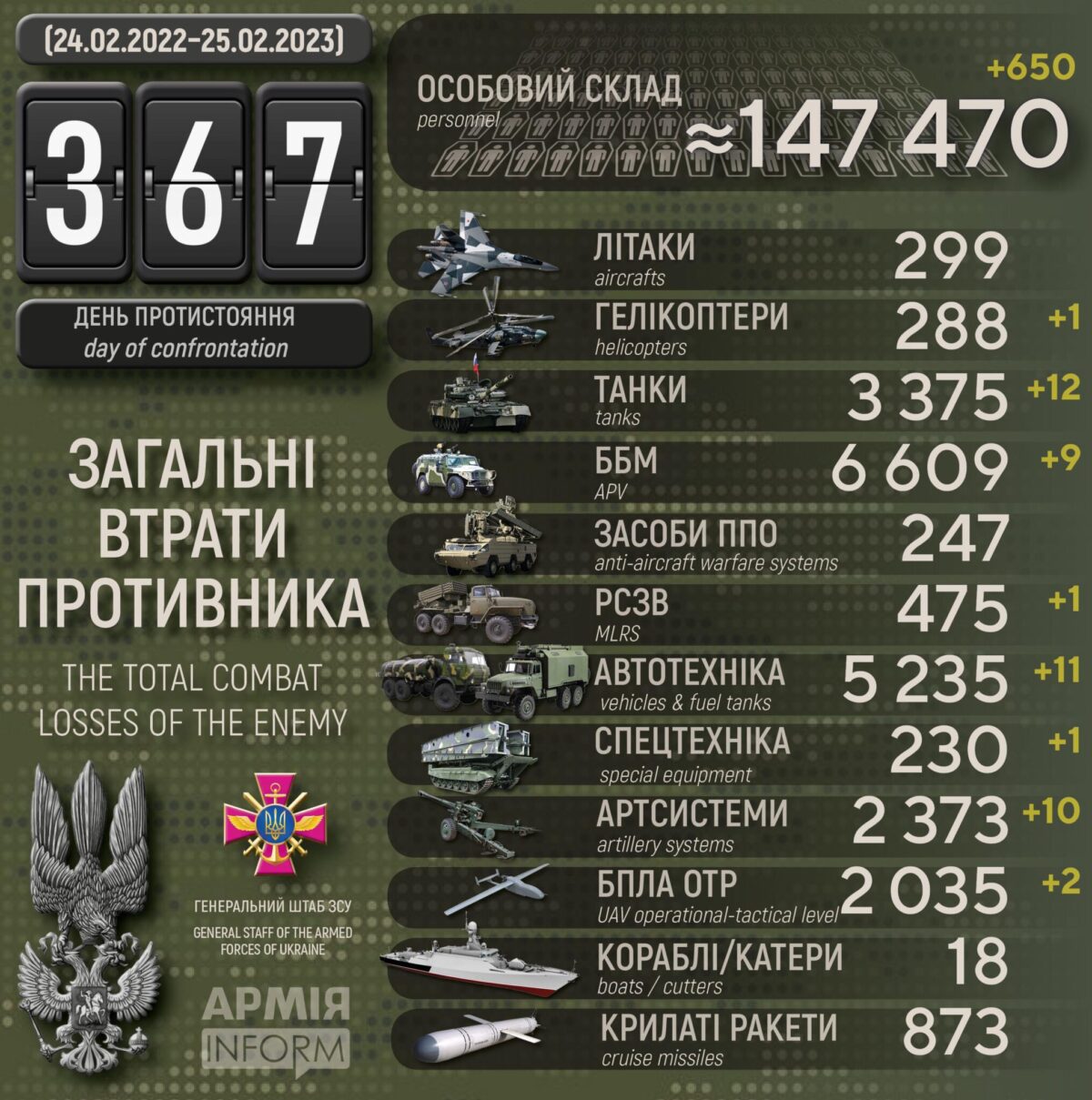 Загальні бойові втрати противника з 24.02.22 по 25.02.23 орієнтовно становлять: