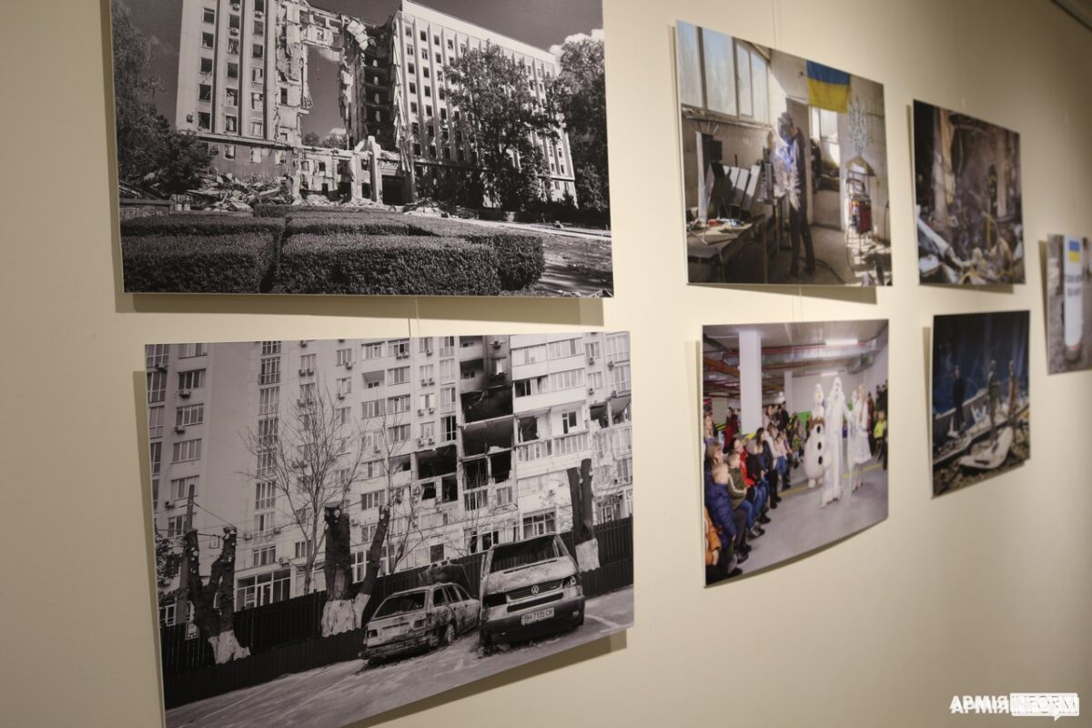 На виставці можна побачити не лише фотороботи. Тут є і залишок від російського касетного снаряда до РСЗВ, інші уламки від снарядів, тобто те, чим ворог намагався зламати українців.