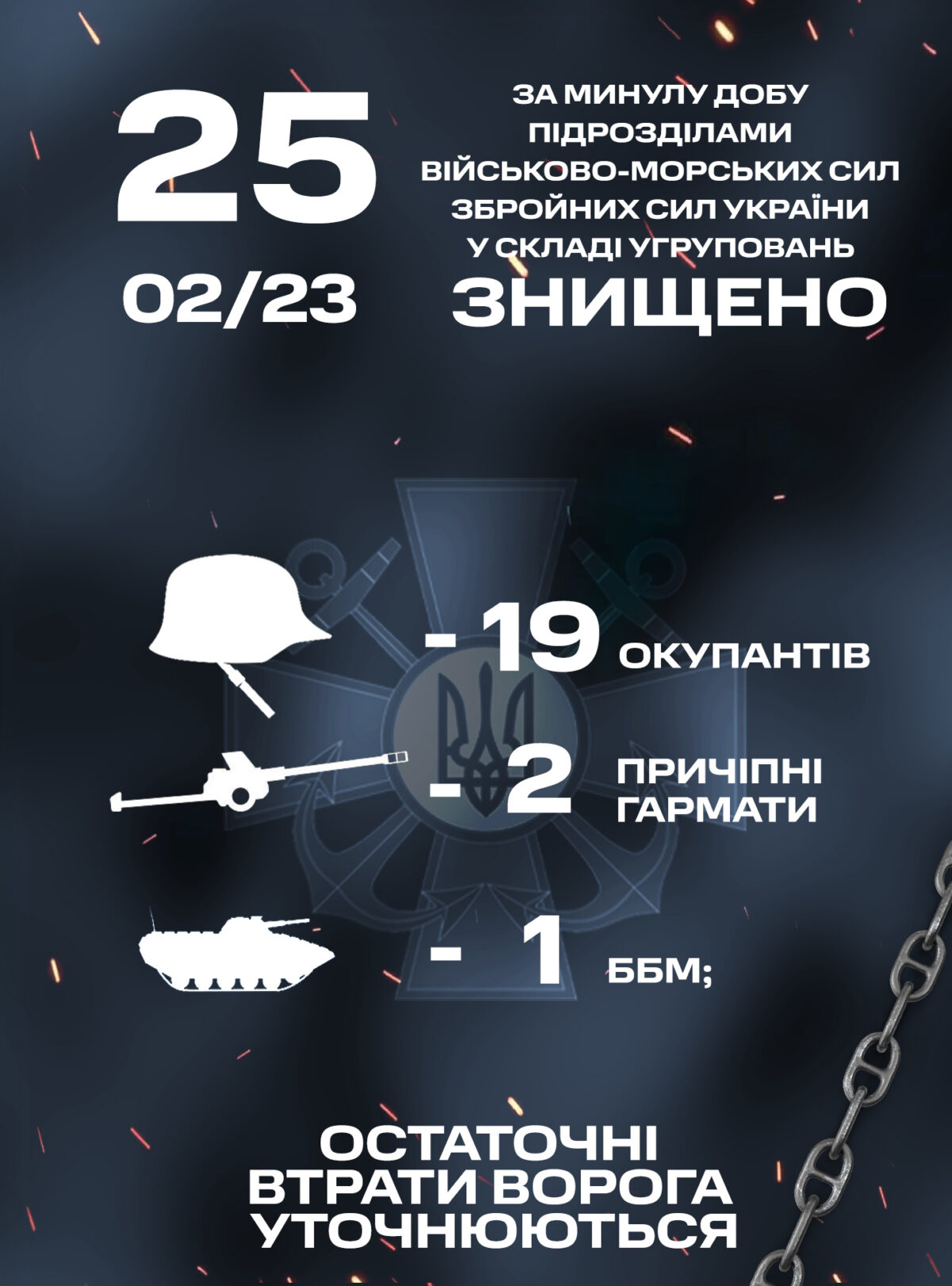 Минулої доби, підрозділами ВМС ЗС України було знищено 19 окупантів, 1 бойову машину піхоти, 2 одиниці причепної артилерії.