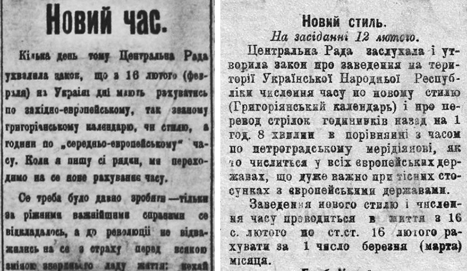 16 лютого 1918 року (за так званим старим стилем — юліанським календарем) частини Армії Української Народної Республіки вступили до визволеного від військ радянської росії Києва. Того ж дня, на виконання закону Центральної Ради від 12 лютого, відбувся перехід на нову систему відліку часу — числення календарних днів почали здійснювати за новим стилем (григоріанським календарем), а годинники перевели на середньоєвропейський час. 16 лютого стало 1 березня.