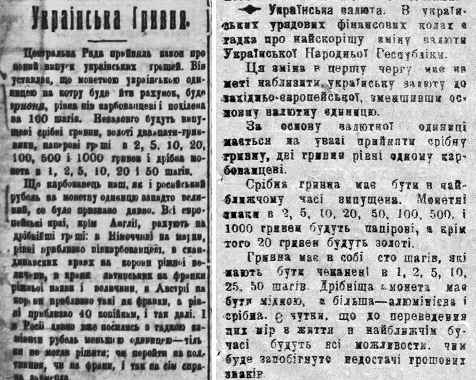 Так модерний календар і нова національна валюта прийшли до українців одночасно із визволенням Києва — у перший день весни 1918 року. Обидві реформи покликані були сприяти інтеграції України до спільноти європейських держав і мали далекосяжні наслідки — сьогодні у вільній Україні ми лічимо дні за григоріанським календарем і розраховуємось гривнею як офіційною державною валютою.