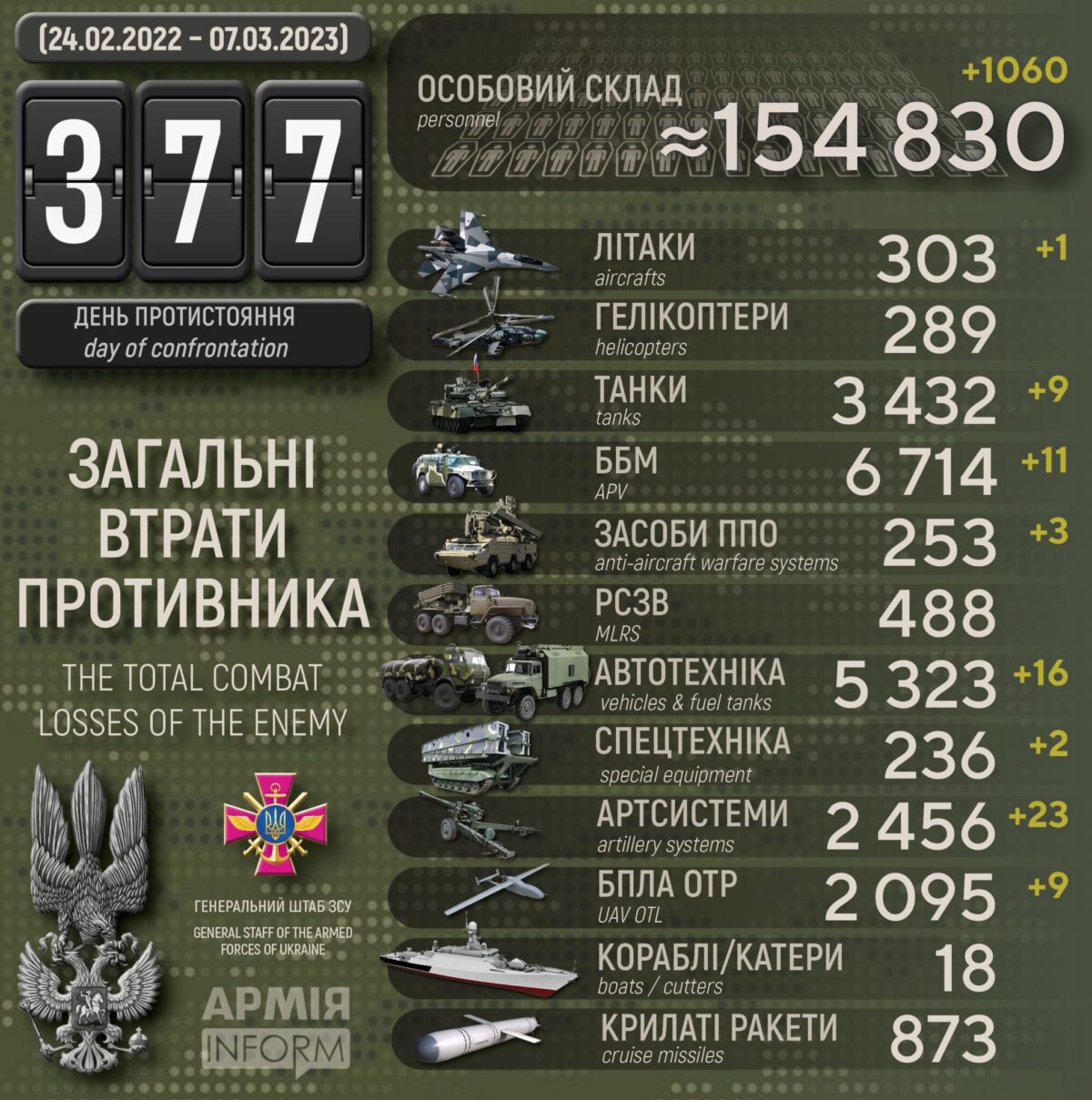 Загальні бойові втрати противника з 24.02.22 по 07.03.23 орієнтовно становлять: