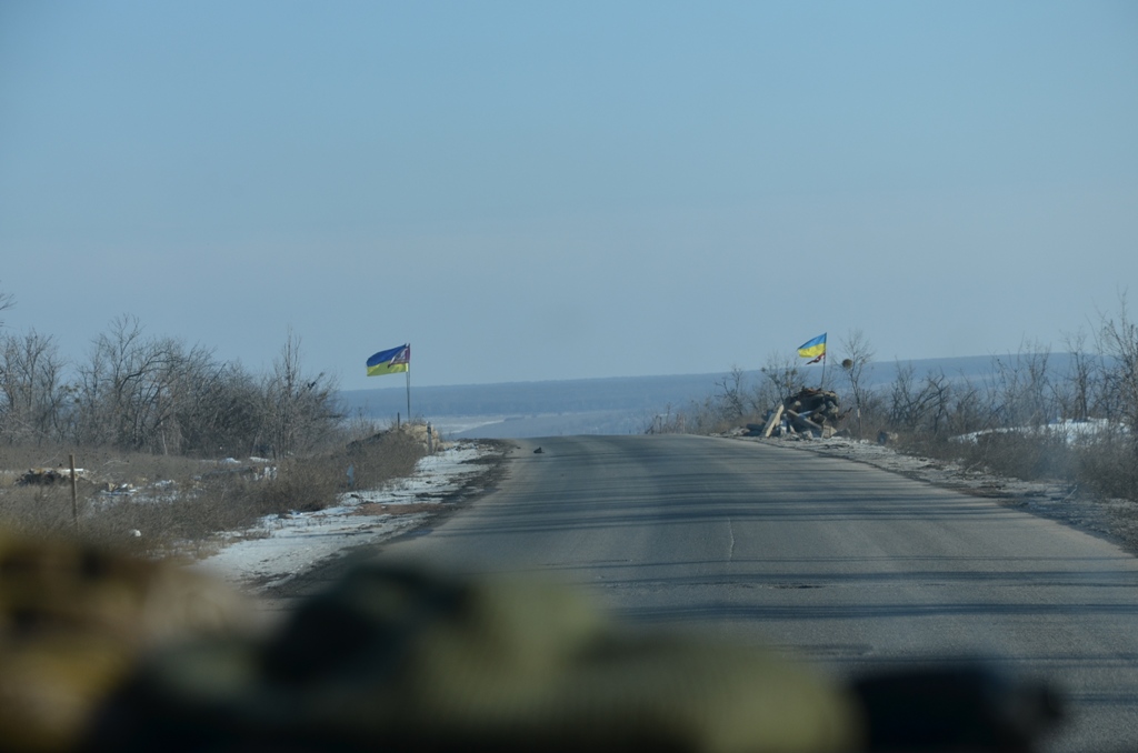 Державні і бригадні прапори позначають місця загибелі українських захисників. Іноді вони майорять так рясно, що фізично відчуваєш кров, якою була залита дорога, якою ти, живий, зараз їдеш.