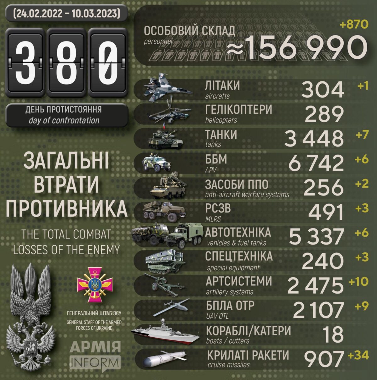 Загальні бойові втрати противника з 24.02.22 по 10.03.23 орієнтовно становлять: