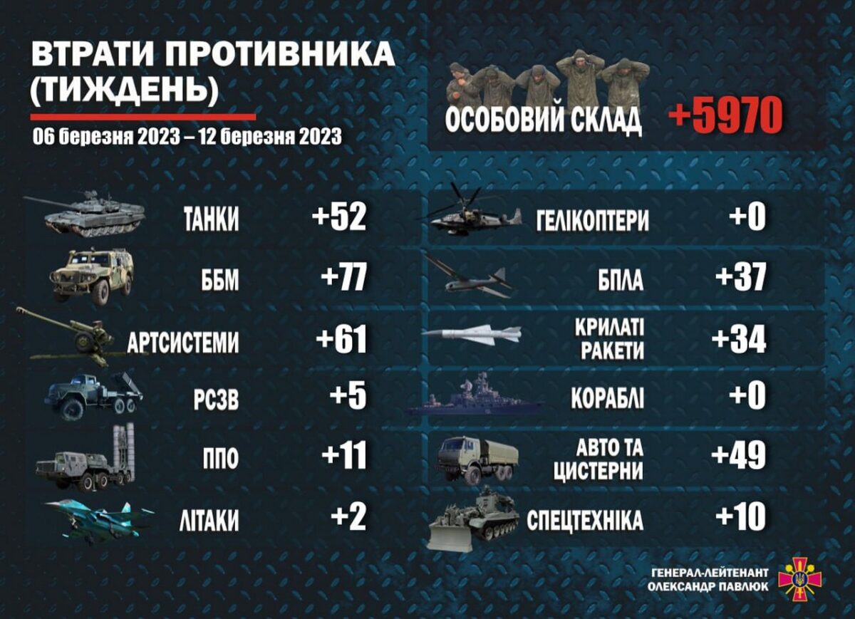За тиждень 06-12 березня Силами оборони України знищено близько 5970 осіб особового складу противника.