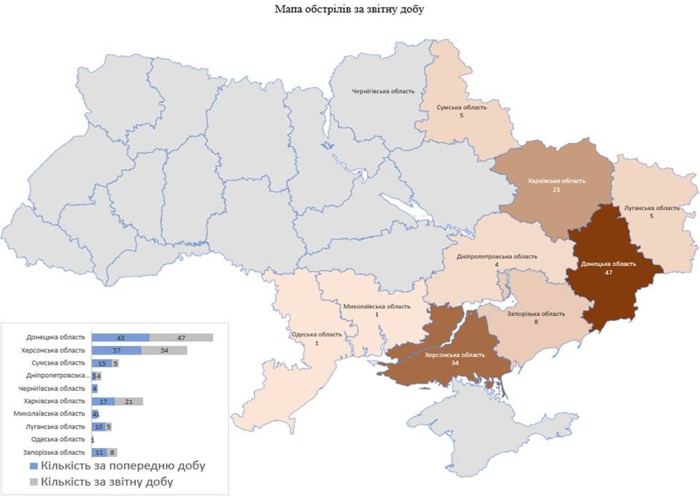 «Під обстріли із мінометів, танків, артилерії, РСЗВ “Град”, ЗРК “С-300”, БПЛА, тактичної авіації потрапили 126 населених пунктів, підтверджено ураження 85 об’єктів інфраструктури», — йдеться в повідомленні.
