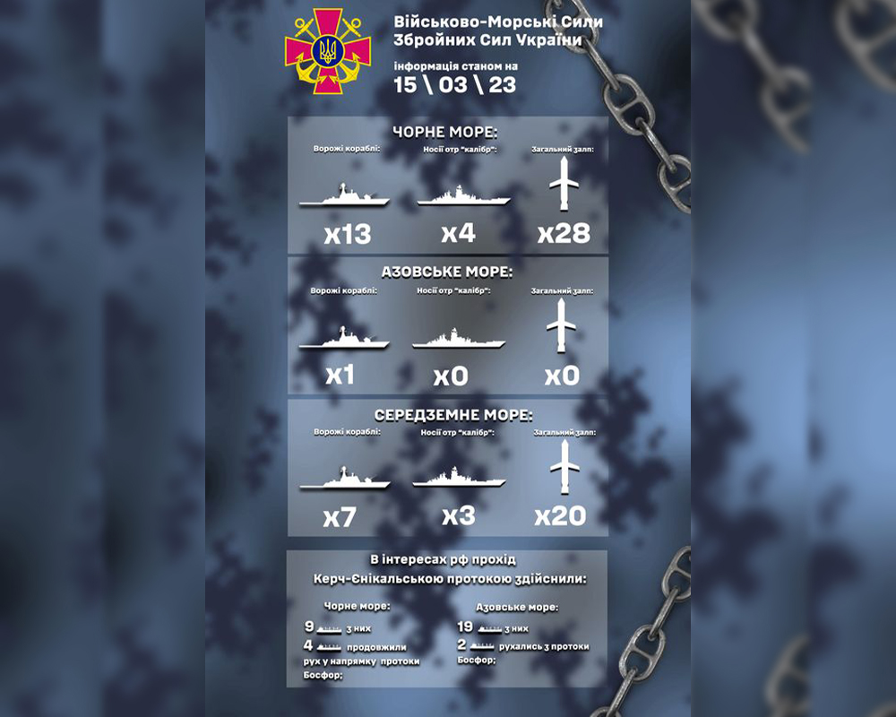 Станом на 15 березня в акваторіях Чорного, Азовського та Середземного морів на бойовому чергуванні перебувають 21 ворожий корабель, з них 7 носіїв крилатих ракет «Калібр». Загальний залп становить — 48 ракет.