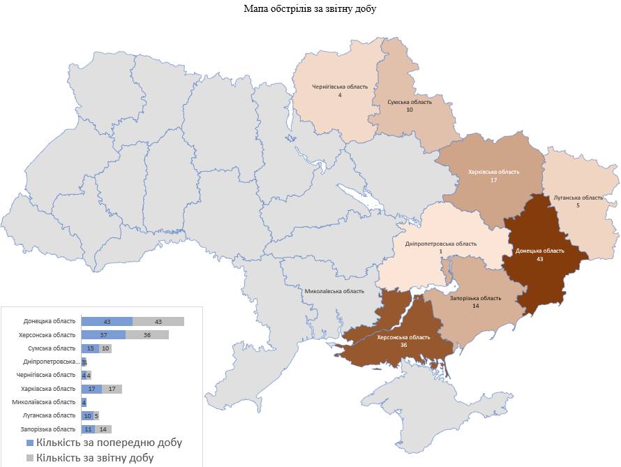 «Загалом з різних видів озброєння (міномети, танки, БМП, артилерія, САУ, РСЗВ «Град», ЗРК «С-300», БПЛА, тактична авіація) здійснено обстріли 130 населених пунктів, підтверджено ураження 100 об’єктів інфраструктури», — йдеться в повідомленні.