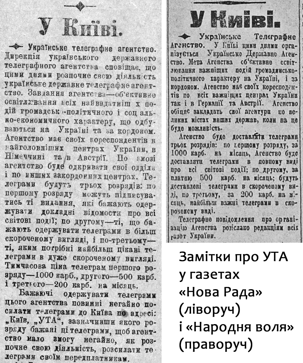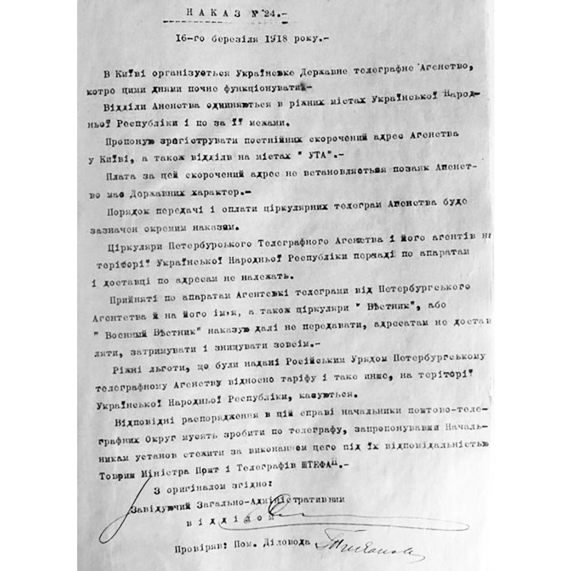 «В Київі організується Українське Державне телеграфне Агентство, котре цими днями почне функціонувати. Відділення Агентства одчиняються в ріжних містах Української Народної Республіки і поза її межами. Пропоную зрегіструвати постійний скорочений адрес Агентства у Києві, а також відділів на містах “УТА”», — зазначалось у наказі. Невдовзі Рада Народних Міністрів затвердила статут агентства.